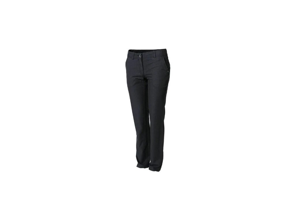 Rubová část předního dílu je zapravena podsádkou. Pasový límec je střižen do tvaru, aby lépe seděl na ženské postavě.V příklopci je kvalitní zdrhovadlo YKK a plastový druk.
