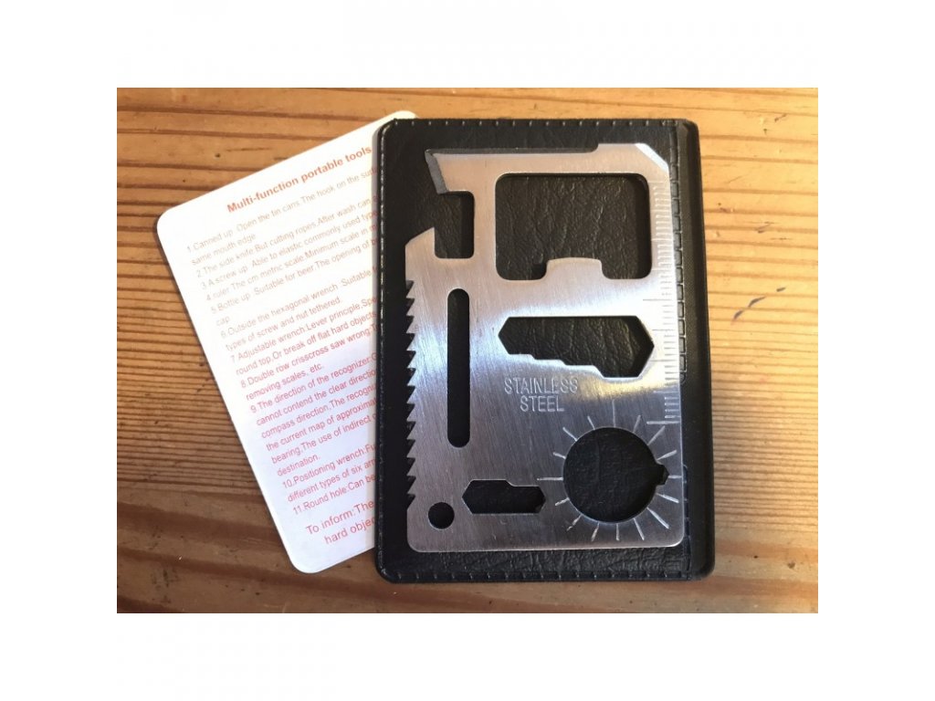 Multifunkční karta (10 různých funkcí) ve velikosti kreditní karty, takže ji můžete mít neustále v peněžence pro případ nouze. Jedinečný poměr ceny a množství užitečných nástrojů.