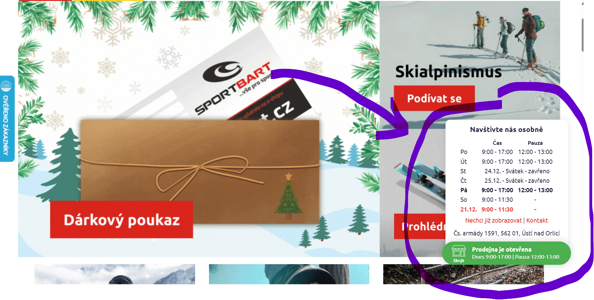 Během vánočního období bude mít naše prodejna Sportbart v Ústí nad Orlicí upravenou otevírací dobu.
