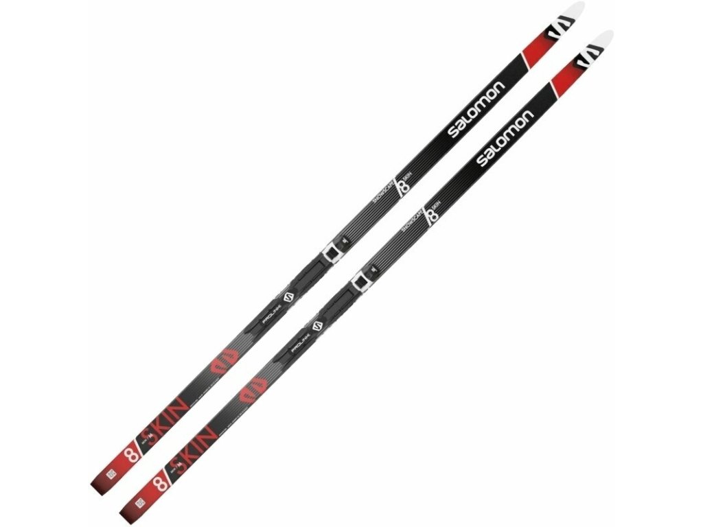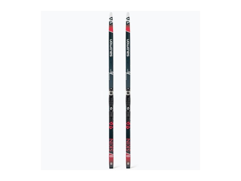 Set běžek Salomon SnowScape 8 Skin s předmontovaným vázáním Salomon Prolink Auto s automatickou hlavicí - stačí našlápnout, pro vystoupení pak zatlačit hůlkou.