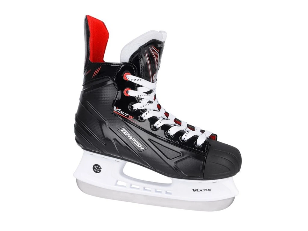 Hokejové brusle TEMPISH VOLT-S jsou vhodné pro aktivní hokejové hráče amatérských soutěží. Skelet brusle má jedinečnou konstrukci, je vyroben z jednoho kusu kompozitního odolného plastu, zajišťuje proměnnou tvrdost pro optimální fixaci nohy. Skelet je velmi lehký, přitom pevný a odolný. Dobře ochrání nohu proti nárazům puku a hokejek. Skelet je velmi dobře anatomicky tvarovaný, zejména v oblasti Achillovy šlachy a kotníků. Skelet poskytuje velmi dobrou podporu a ochranu kotníků. O pohodlí se starají pěnové výstelky, zejména v oblasti kotníků a Achillovy šlachy a anatomická vkládací vložka, která kvalitně zafixuje chodidlo v brusli. Jazyk má anatomicky tvar, je středně silně vyztužený, skládaný ze dvou dílů, čímž zaručuje komfortní obemknutí nártu, kotníku a spodní holeně. Vnitřní materiál z mikrovlákna (CAMBRA brushed nylon), díky kterému noha v brusli neklouže, dodává jistotu pro bruslaře. Také efektivně odvádí vlhkost a dobře vysychá po skončení bruslení. Brusle je osazena kvalitním nožem z nerezavějící oceli.
